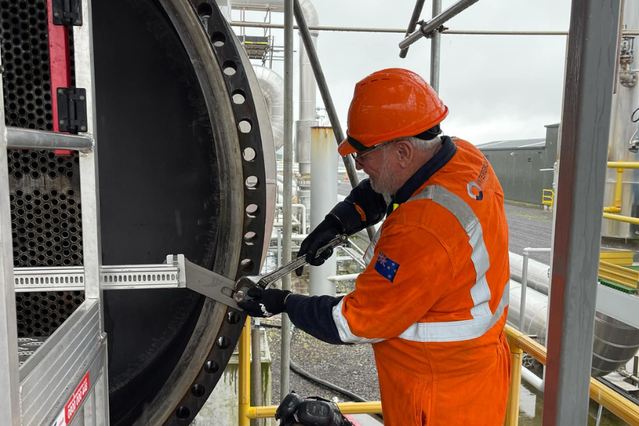 One of our technicians tightening flange bolts during heat exchanger cleaning to ensure safe and efficient operation